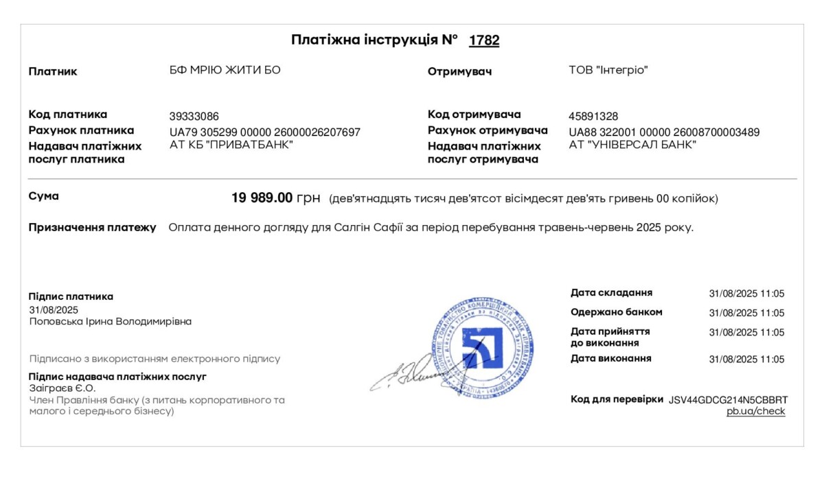 CO CF “Dream to Live” expresses its sincere gratitude to our patrons and partners — the shafa.ua and volonter. by.prom for their financial support, which covered the cost of day care for Salgyna Safiya for the period May–June 2025 in the amount of UAH 19,989 at the Inclusive Center “World of Opportunities.”