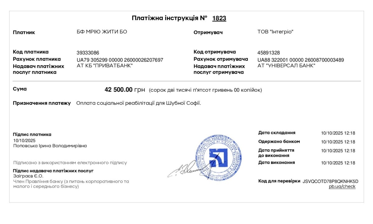 The charity fund “Dream to Live” paid for social rehabilitation for Shubna Sofia at the Inclusive Center “World of Opportunities” in the amount of UAH 42,500.