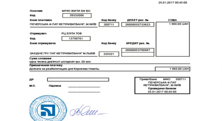 Благодійний фонд “Мрію Жити” вніс доплату за реабілітацію для Корнєєва Микити.
