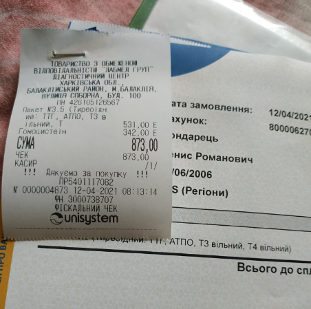 Аналізи було пройдено у Харківській лабораторії INVIVO ( “контроль гомоцис”, ТТГ, АТПО, Т3, гомацистеїн) та у центрі “Лабмед Груп”(клінічний аналіз крові).