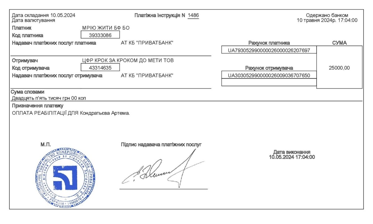 БО БФ “Мрію жити” вчасно оплатив реабілітацію для Кондратьєва Артема в Центр Фізичної Реабілітації “Крок за кроком до мети” на загальну суму 25 000 грн.