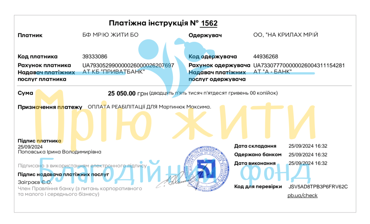 БО БФ “Мрію жити” висловлює щиру подяку нашим меценатам та партнерам — платформі Шафа та Volonter by Prom — за фінансову підтримку, завдяки якій було вчасно сплачено реабілітацію для Мартинюка Максима в ГО “НА КРИЛАХ МРІЙ” на суму 25 050 грн.