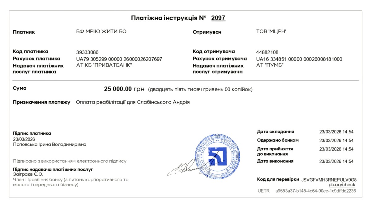 Благодійний фонд «Мрію жити» спільно з платформою dobro.ua та небайдужими благодійниками оплатив курс реабілітації для Слабінського Андрія в Міжнародний центр реабілітації та нейрофізіології на суму 25 000 грн.