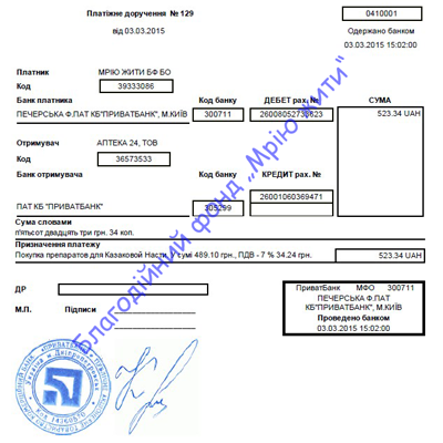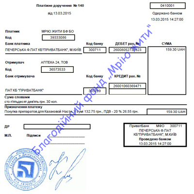 Призначення платежу: Благодійна допомога